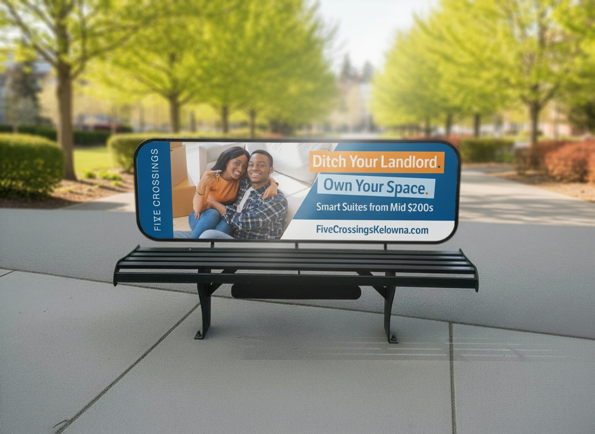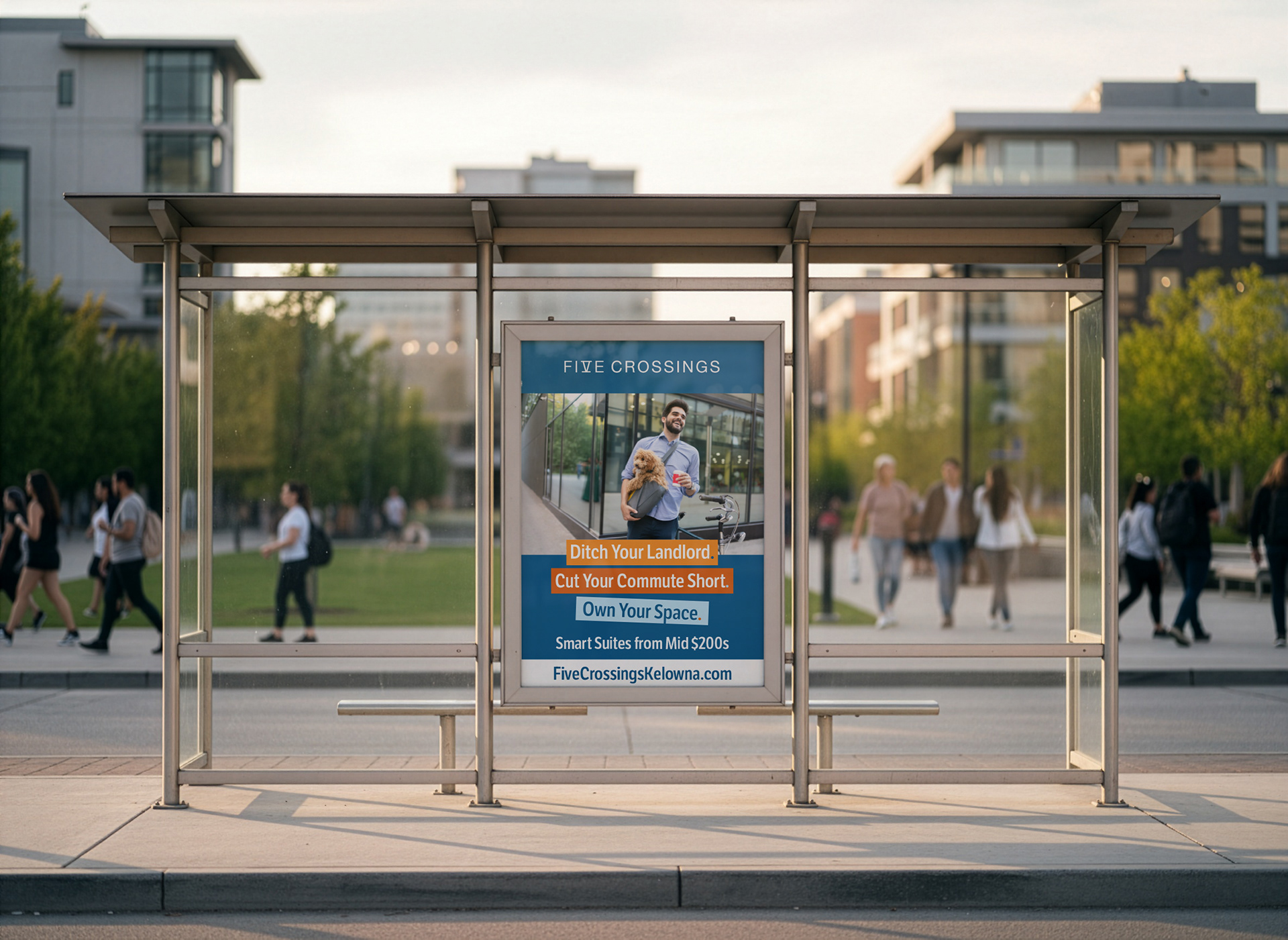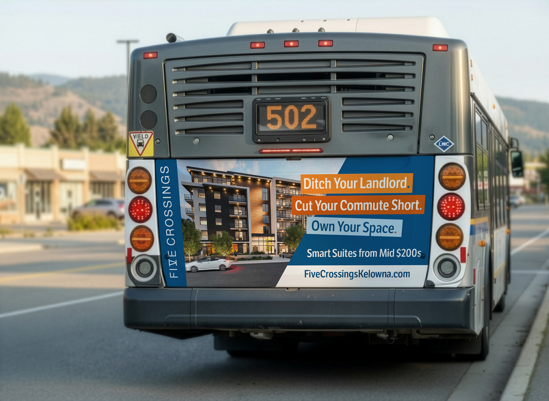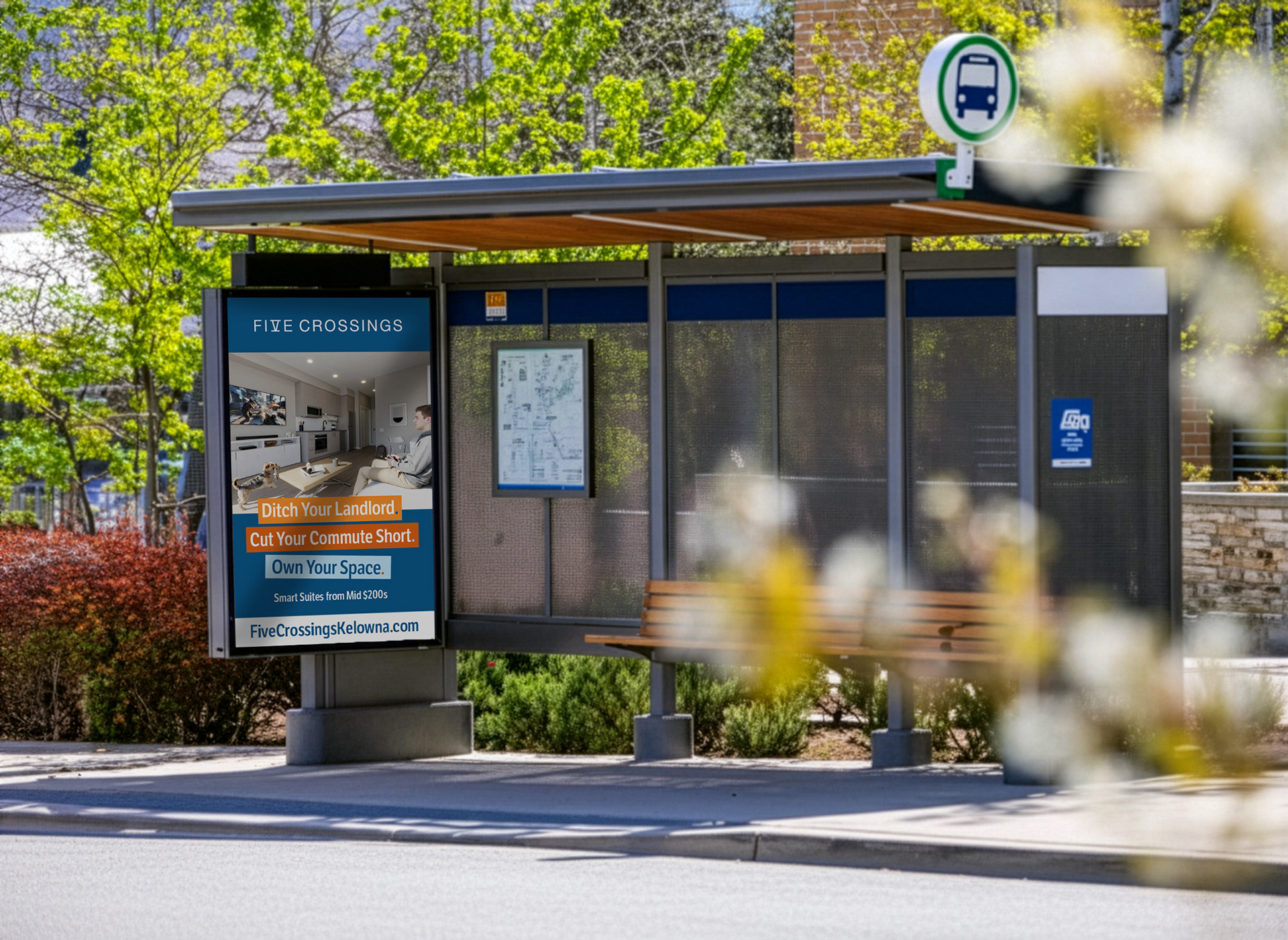 I led the visual identity and presentation centre design, creating a modern, energetic system that clarified complex information and reframed small space living as a smart lifestyle choice. This approach extended across environmental graphics, sales materials, and a transit led campaign including bus wraps, transit shelters, and benches, designed to meet students and young professionals within their daily routines. The message Ditch your landlord. Cut your commute short. Own your space. reinforced ownership near UBCO as practical and within reach.